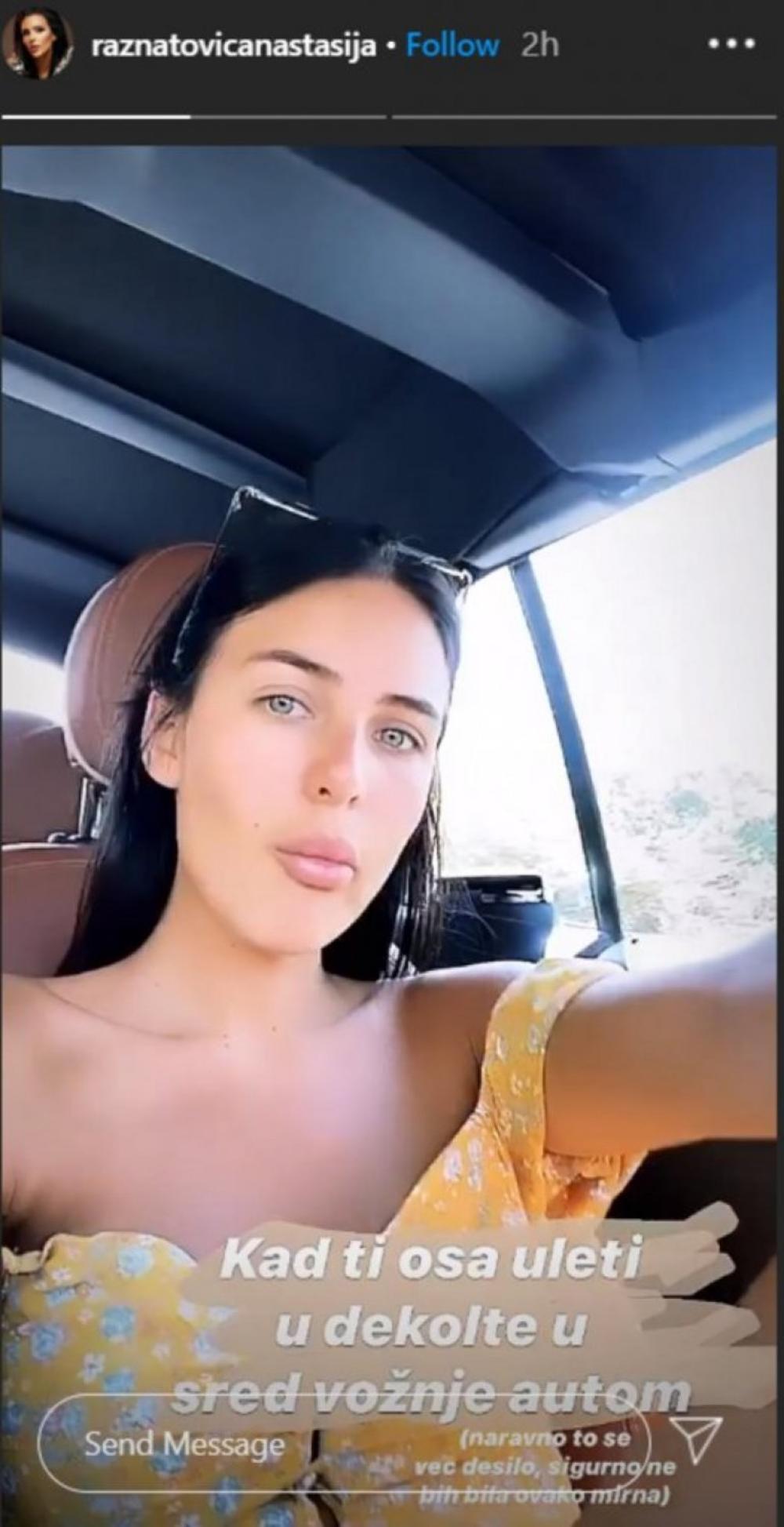Anastasija Ražnatović je na svom Instagram profilu objavila video snimak kako vozi, ali uz to je napisala da joj je osa upala u dekolte.