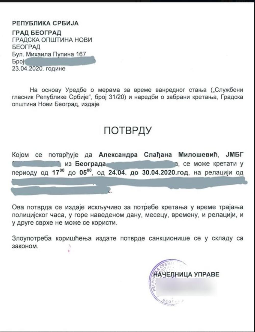 "Nema govora ni o kakvom mom hapšenju. Radi se o proveri dozvole kretanja koja mi je izdata od strane lokalne policije na Novom Beogradu. Sremskomitrovačka policija, koja me je zaustavila da proveri da li imam dozvolu kretanja van Beograda - koju posedujem, nije potražila dokaz o dozvoli od beogradske policije i samo iz tog razloga sam dala iskaz o svom kretanju. To pitanje će već danas biti razrešeno. Da li je moj bivši partner, mitrovački policajac Igor S. , svojom inicijativom, učestvovao u ovom događaju, ne znam, s obzirom da nismo u kontaktu. Jedini drugi izvor koji je upoznat sa mojim kratkom izjavom je, za nasilje optuženi, policajac Igor S.", rekla je pa dodala: