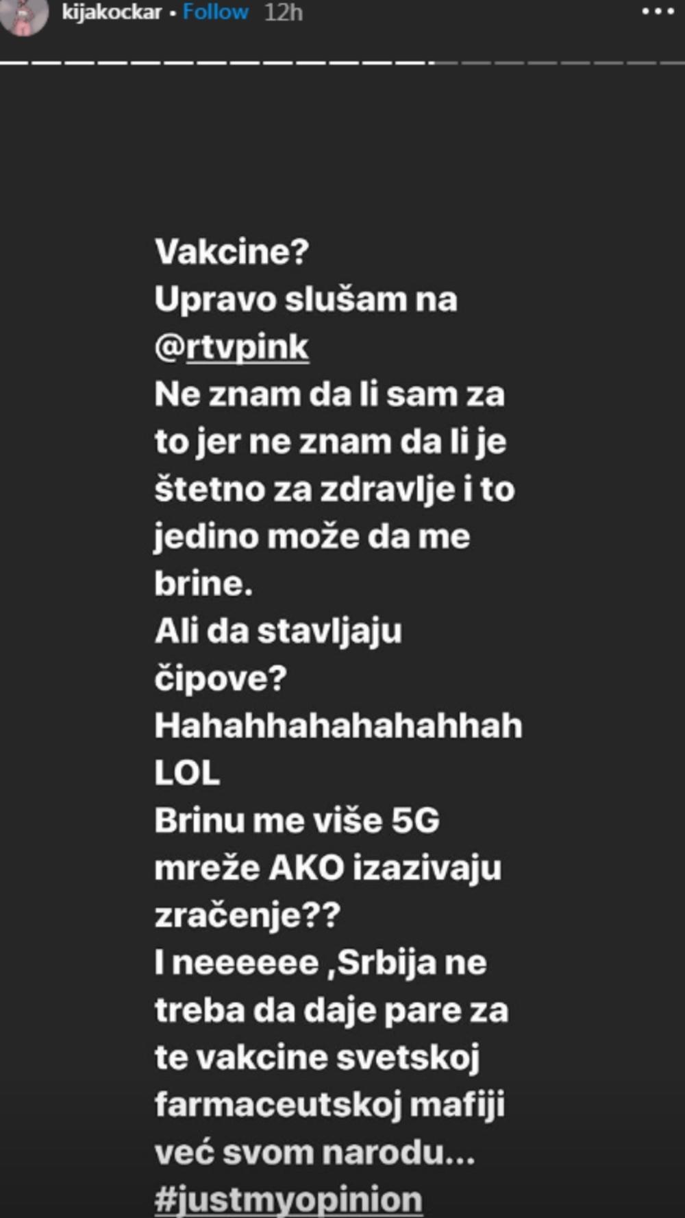 Pevačica Kristina Kija Kockar gledala je sinoć emisiju na televiziji u kojoj su govorili o vakcinaciji protiv virusa korona, a nakon toga se oglasila na Instagramu.