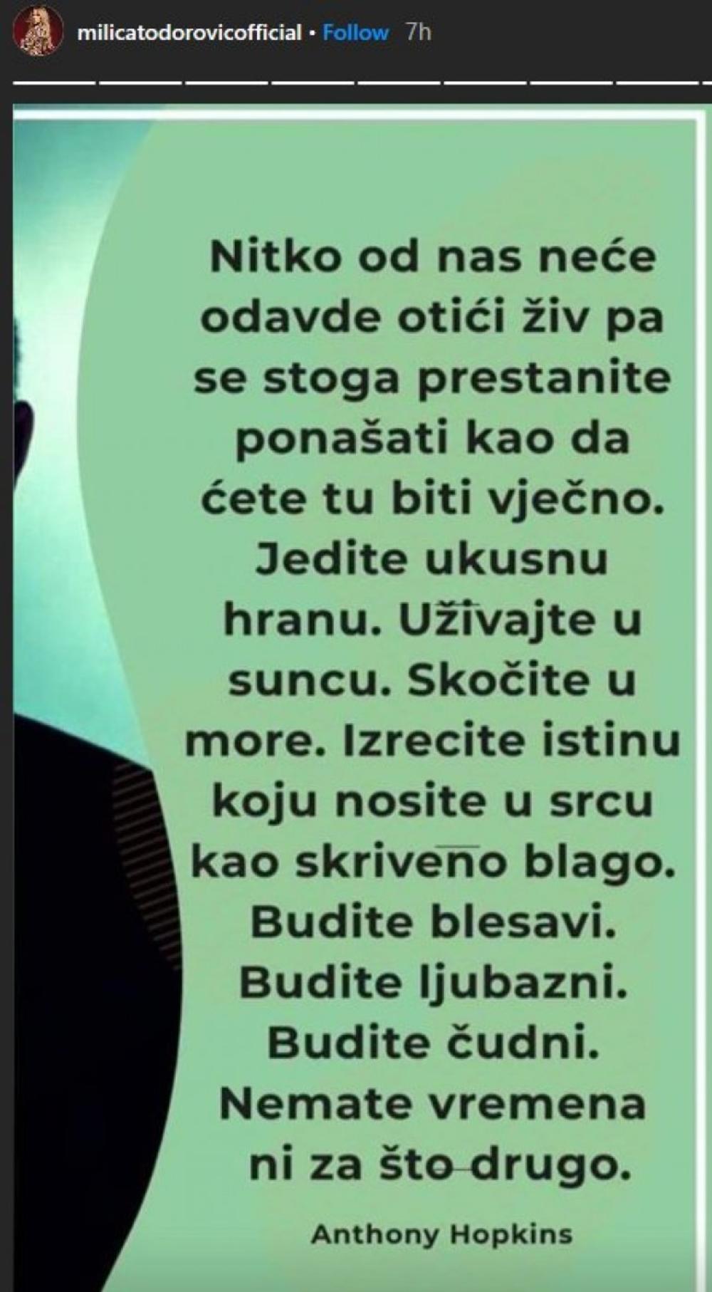 Naime, Milica je Instagramu objavila čudan stori, kojim je apelovala na ljude, da prestanu da se ponašaju kao da će živeti večno već da uživaju u čarima života te da stoga probaju sve što im je srcu drago.