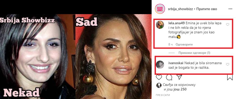 Na jednoj Instagram grupi pojavila se slika Emine Jahović, nekad i sad, odnosno slika na kojoj tvrde da pevačica posle brojnih operacija lica više ne izgleda kao što je nekada, što je uznemirilo sve koji je znaju iz prošlosti.