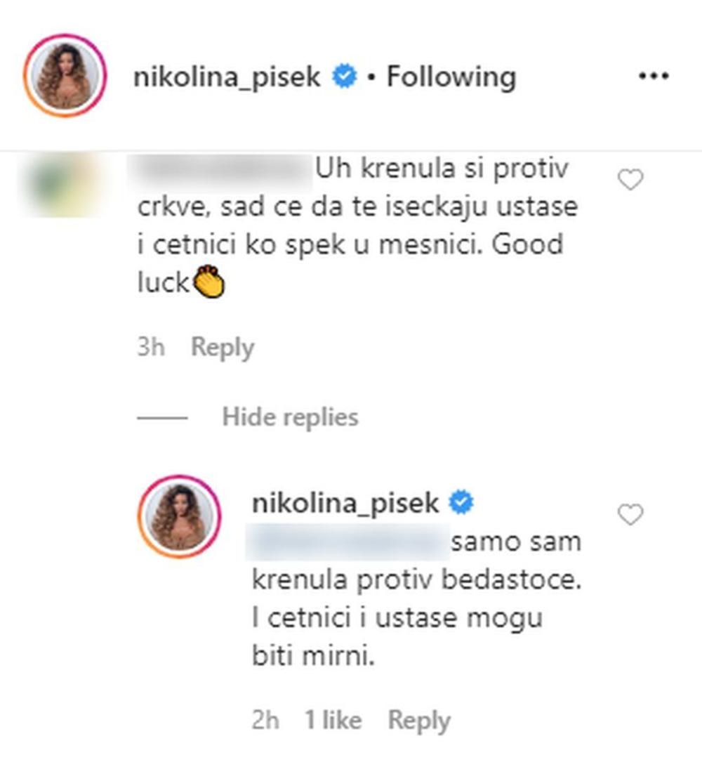 - Samo sam krenula protiv bedastoće. I četnici i ustaše mogu biti mirni - odgovorila je Nikolina na taj komentar.