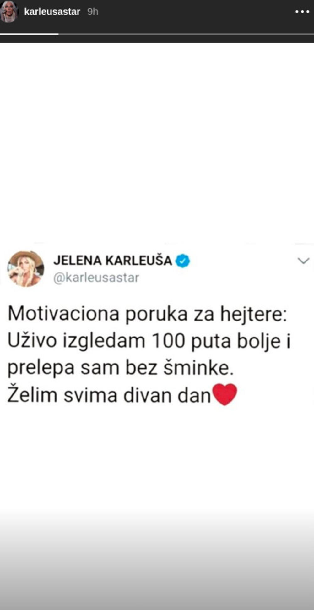 - Motivaciona poruka za hejtere: Uživo izgledam 100 puta bolje i prelepa sam bez šminke. Želim svima lep dan - podelila je Karleuša i svima stavila do znanja neke stvari.