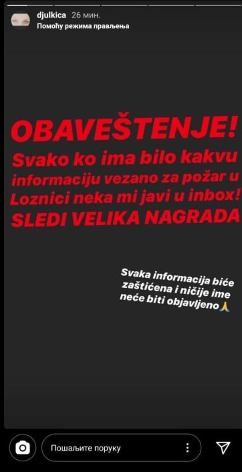 "Svako ko ima bilo kakvu informaciju vezano za požar u Loznici neka mi javi u inboks. Sledi velika nagrada", isticala je ona, koja se po svemu sudeći neće smiriti dok Rašida ne pronađe.