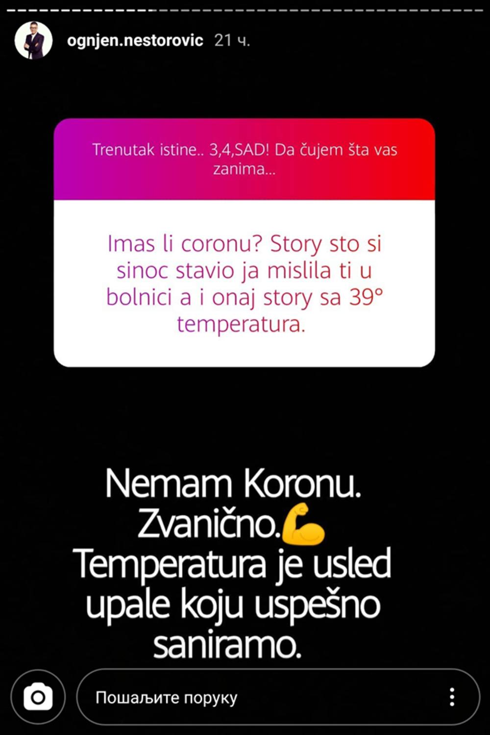 - U ponedeljak sam se probudio sa jakim teskobama i jakom temperaturom. Išao sam u Dom zdravlja, ali su me vratili zbog toga što ljudi koji imaju temperaturu moraju u kovid bolnicu. Na kraju sam došao u infektivnu gde su mi snimili pluća. Zaključeno je da imam upalu pluća, hospitalizovali su me. Radili su mi test na kovid, sinoć je stigao i negativan sam. Svi parametri su dobri, krvna slika je dobra, najvažnije mi je da nemam to - kaže Ognjen.