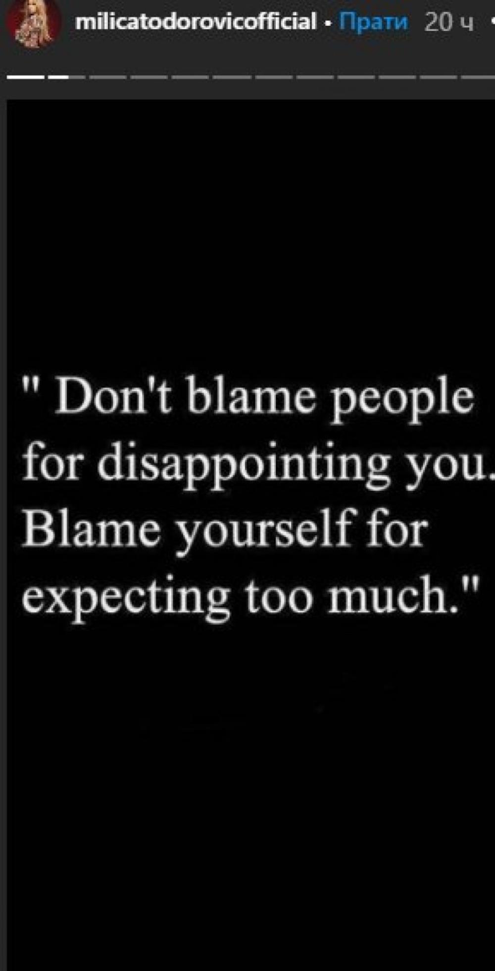 - Ne krivite ljude zato što su vas razočarali, krivite sebe što ste mnogo očekivali - istakla je Todorovićeva na Insta storiju samo dva sata nakon što je objavljena Petrova slika sa Hristinom.