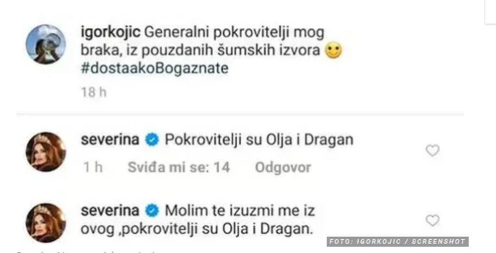 "Pokrovitelji su Olja i Dragan", napisala je najpre Severina pa dodala: "Molim te izuzmi me iz ovog, pokrovitelji su Olja i Dragan."