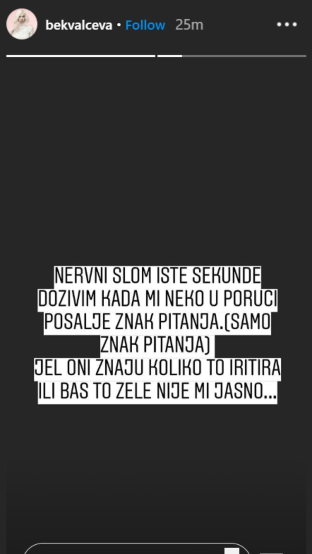- Nervni slom iste sekunde doživim kada mi neko u poruci pošalje znak pitanja (samo znak pitanja) - napisala je Nataša na storiju, pa se zapitala: