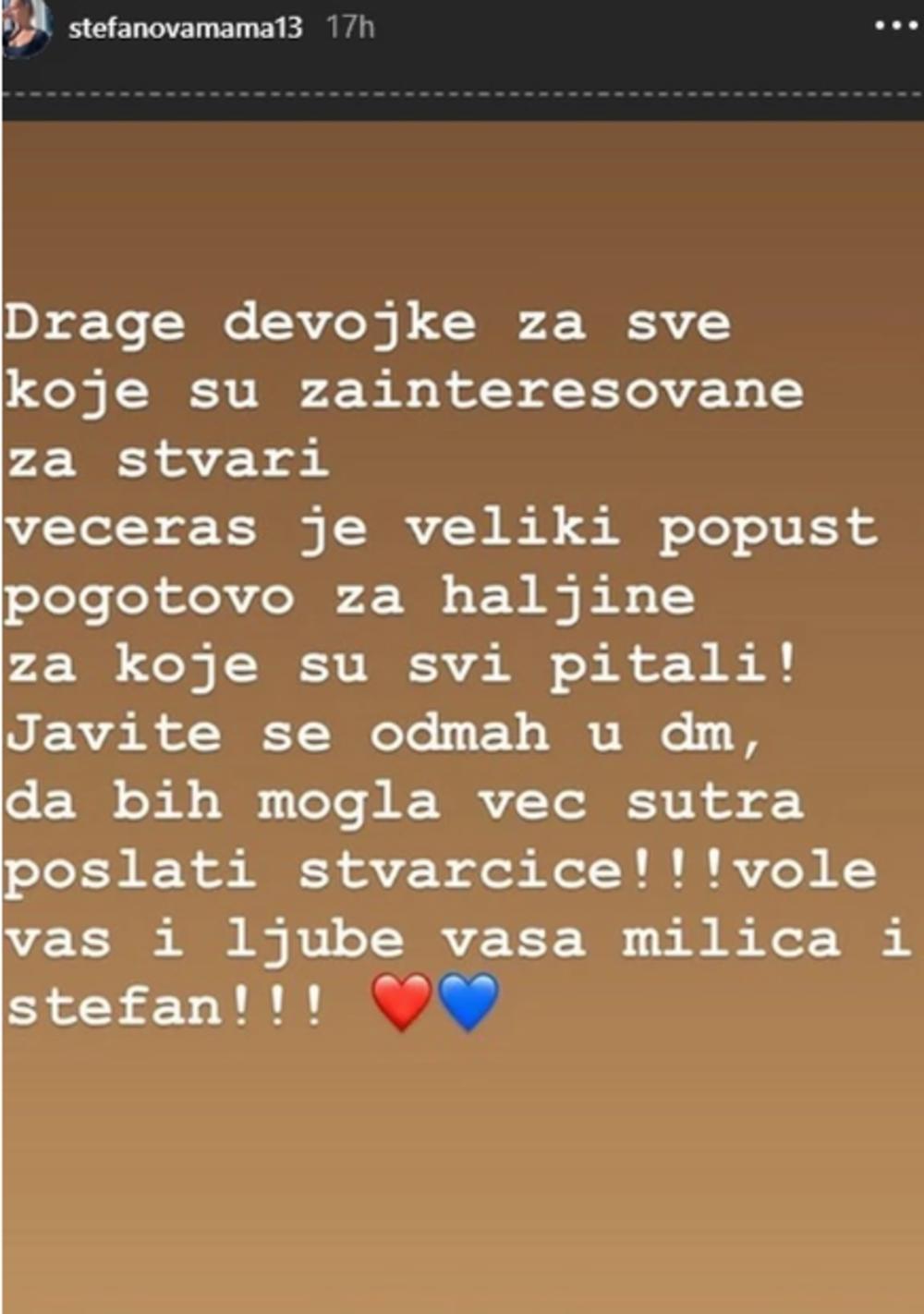 - Drage devojke, za sve koje su zainteresovane za stvari, večeras je veliki popust, pogotovo za haljine za koje su svi pitali! Javite se odmah u DM, da bih mogla već sutra poslati stvarčice - poručila je Milica svojim pratiocima.