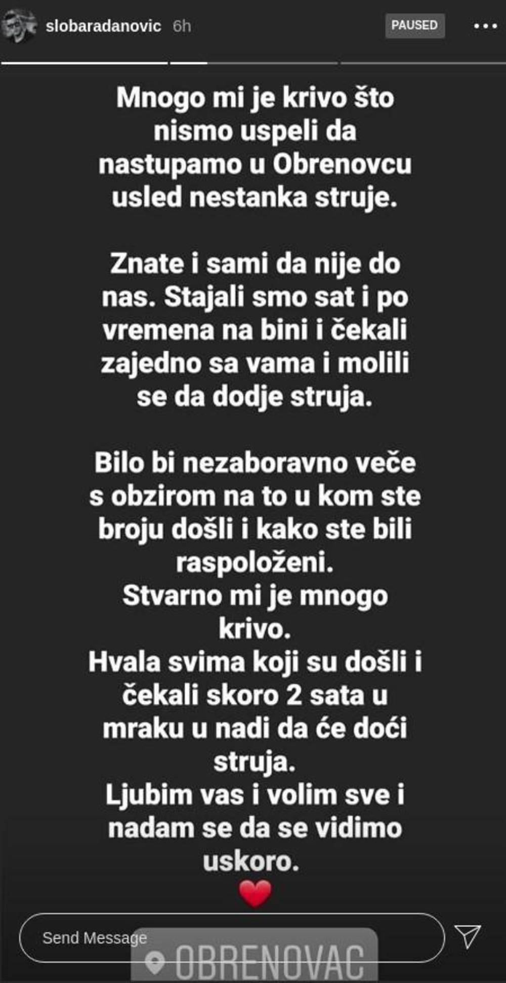 - Mnogo mi je krivo što nismo uspeli da nastupamo u Obrenovcu usled nestanka struje. Znate i sami da nije do nas. Stajali smo sat i po vremena na bini i čekali zajedno sa vama i molili se da dođe struja. Bilo bi nezaboravno veče, s obzirom na to u kom ste broju došli i kako ste bili raspoloženi. Stvarno mi je mnogo krivo. Hvala svima koji su došli i čekali skoro dva sata u mraku, u nadi da će doći struja. Ljubim vas i volim sve i nadam se da se vidimo uskoro - napisao je Sloba dodavši uz poruku i stiker crvenog srca.