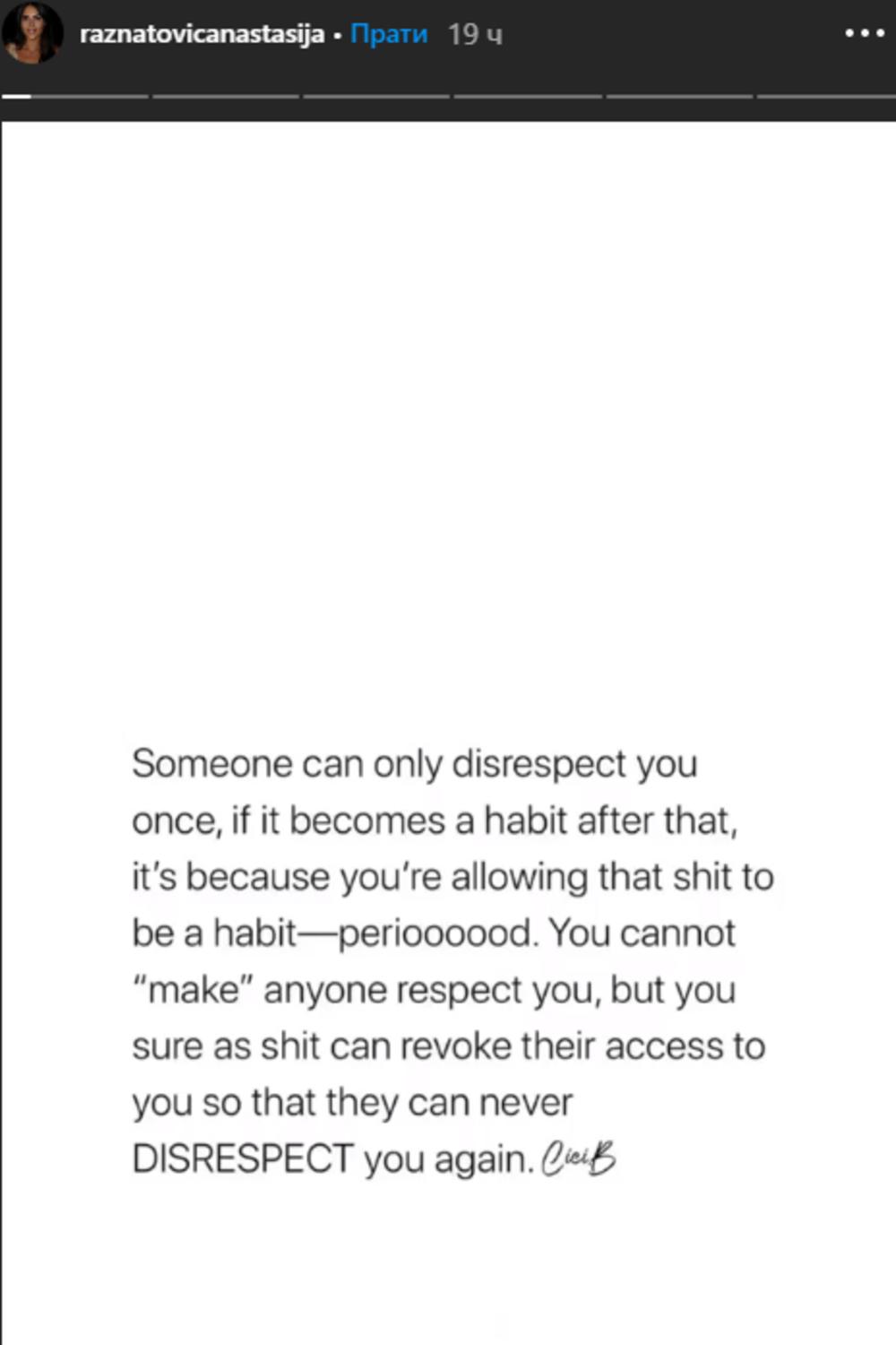 – Neko može da vas ne poštuje samo jednom, ako to postane navika, to je zato što vi to dozvoljavate. Ne možete naterati nekoga da vas poštuje, ali definitivno možete prekinuti njihov prilaz vama da vas nikada više ne bi ponizili – napisala je Anastasija.