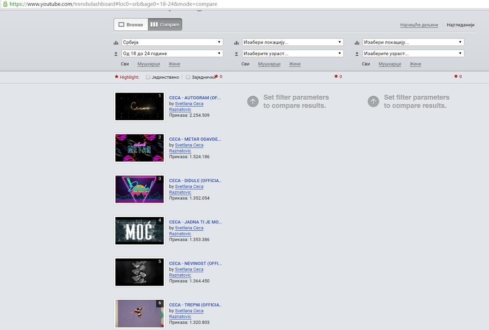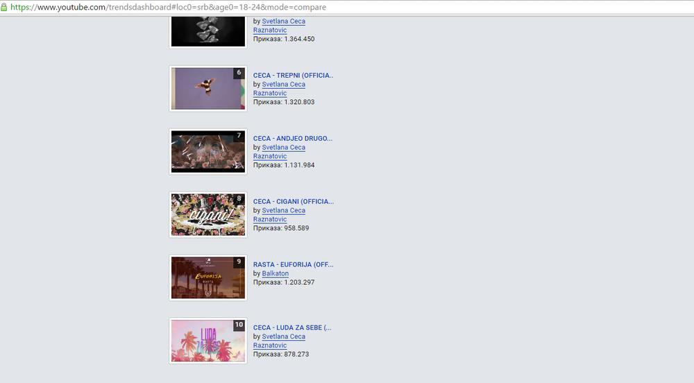 Ceca Ražnatović je ubedljivo vodila prema Jutjubu i na rubrici "U trendu", šurila je konkurenciju.