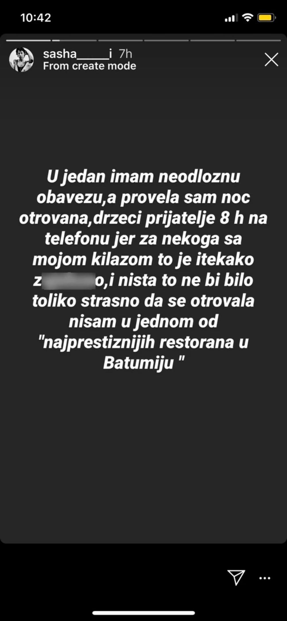 - U jedan imam neodložnu obavezu, a provela sam noć otrovana, držeći prijatelje osam sati na telefonu jer za nekoga sa mojom kilažom to je i te kako za.....o, i ništa ne bi bilo toliko strašno da se nisam otrovala u jednom od "najprestižnijih restorana u Batumiju".