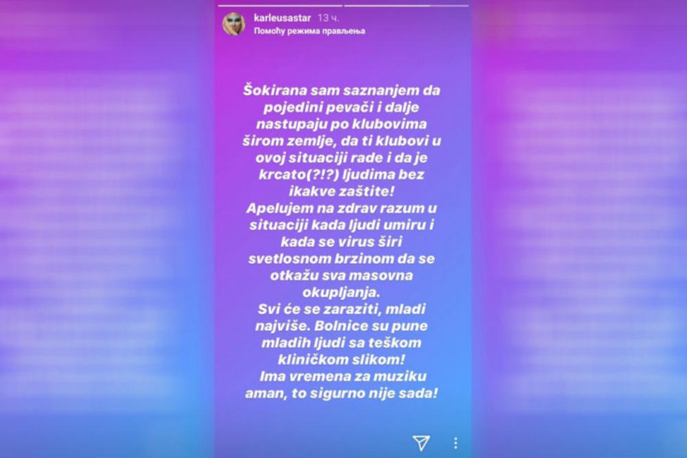 Karleuša je nedavno obavestila svoju publiku da se njeni koncerti i nastupi neće održati sve dok se epidemiološka situacija ne stabilizuje