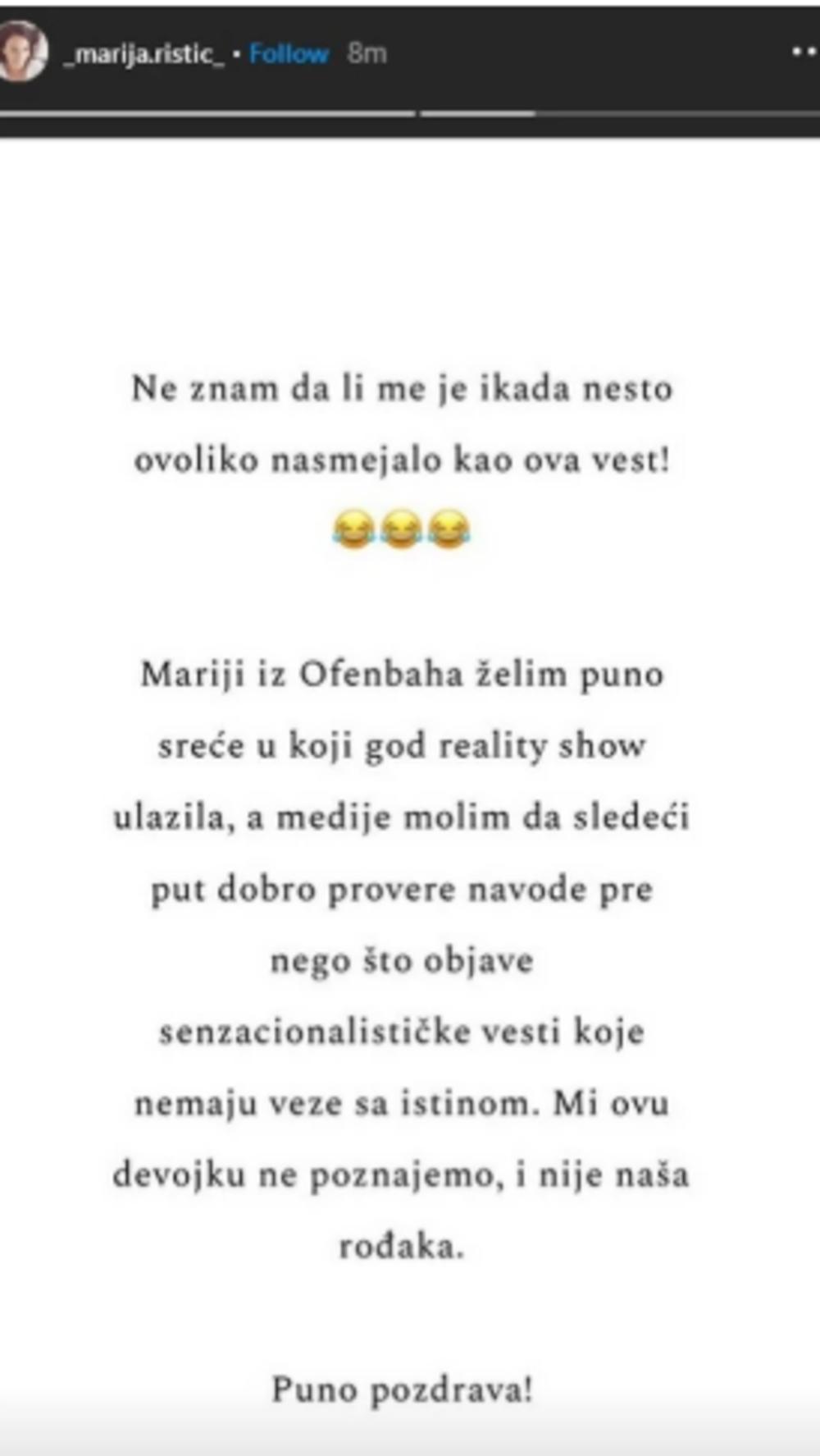 - Ne znam da li me je iko ikada nešto ovoliko nasmejalo kao ova vest! Mariji iz Ofenbaha želim puno sreće u koji god rijaliti šou ulazila, a medije molim da sledeći put dobro provere navode pre nego što objave senzacionalističke vesti koje nemaju veze sa istinom. Mi ovu devojku ne poznajemo, i nije naša rođaka. Puno pozdrava - napisala je Marija Ristić u svojoj objavi i time demantovala navode da je devojka koja ulazi u novu sezonu Zadruge njihova rođaka.