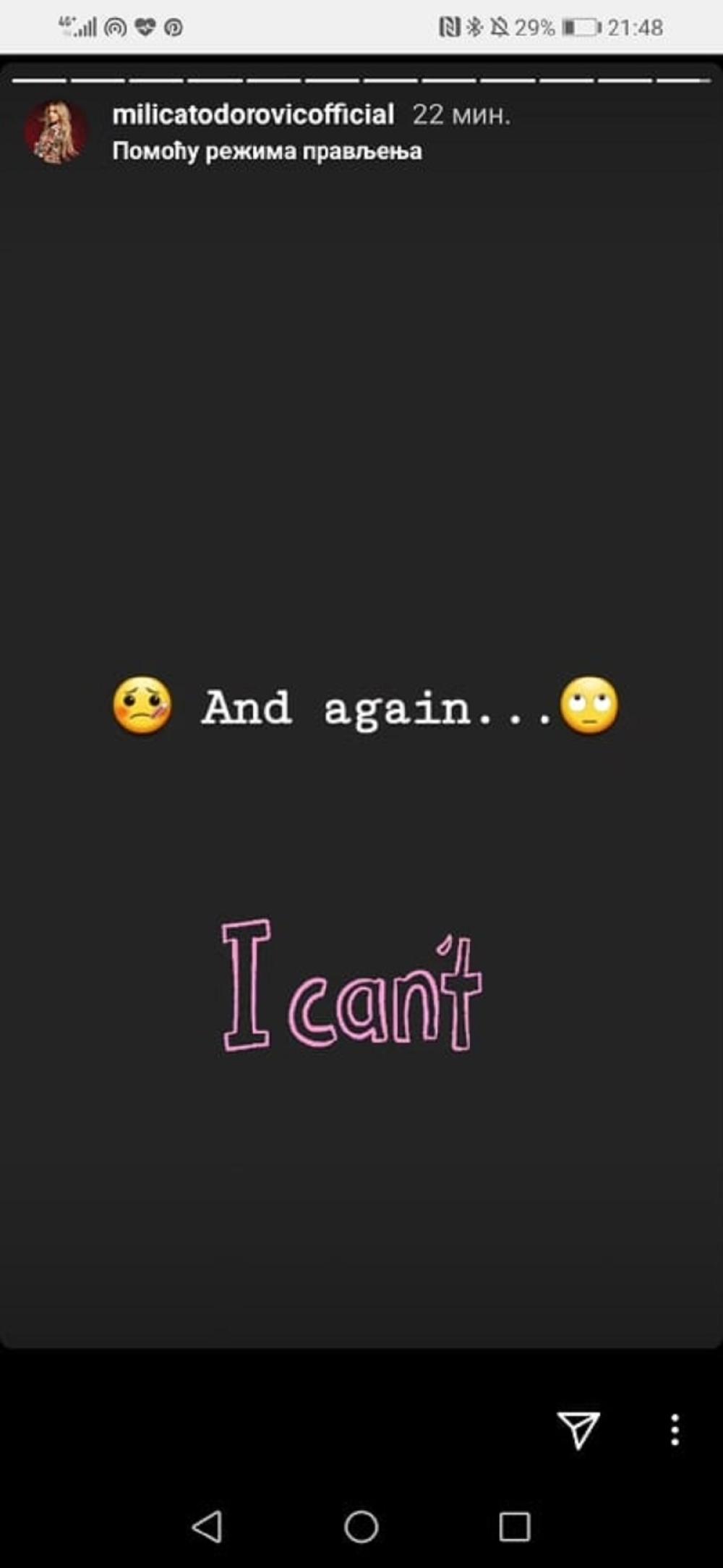 Naime, Milica je objavila stori sa smajlijem kojim meri temperaturu i izgleda bolesno, a u komentaru je napisala: "I opet, ne mogu!", misleći predpostavljamo na visoku temperaturu koja nije prošla.