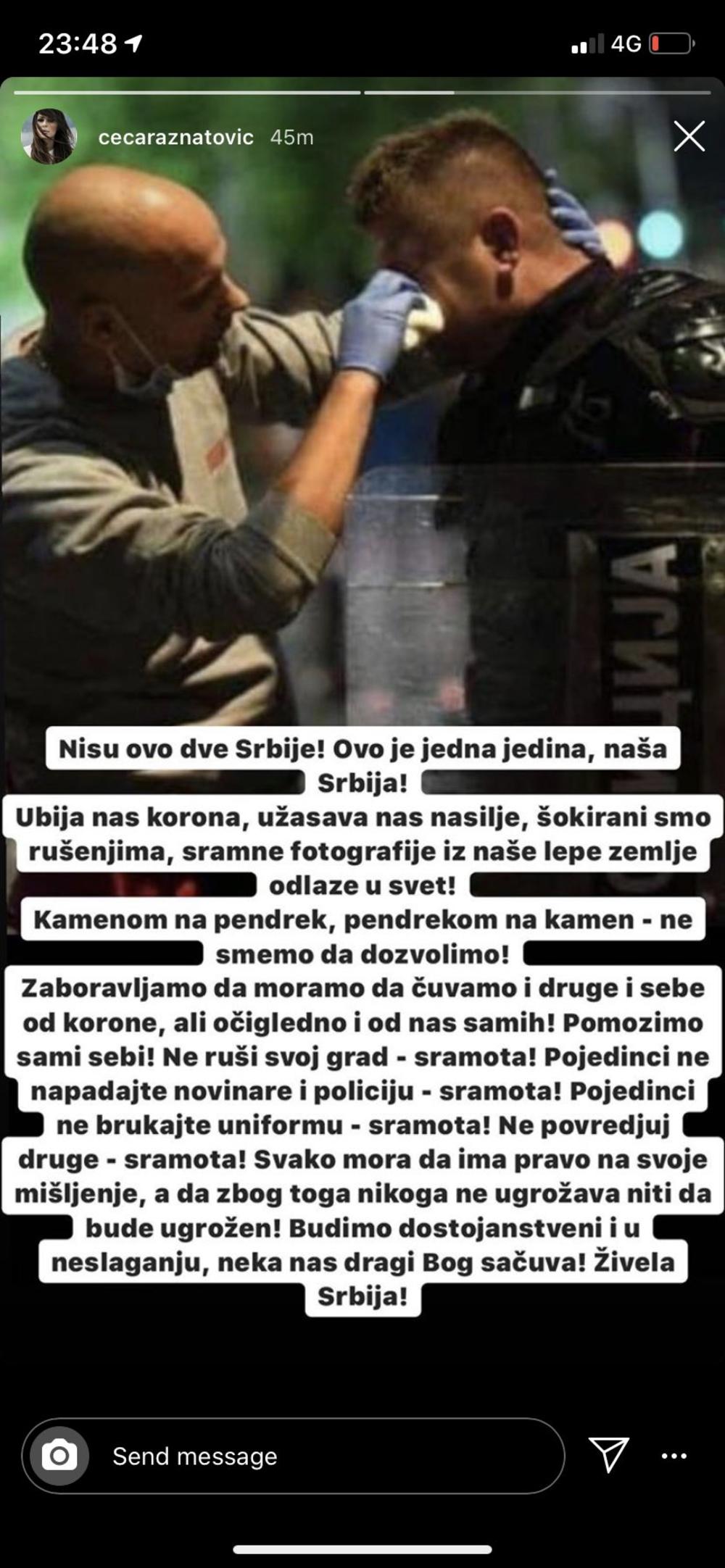 Zaboravljamo da moramo da čuvamo i druge i sebe od korone, ali očigledno i od nas samih! Pomozimo sami sebi! Ne ruši svoj grad - sramota! Pojedinci ne napadajte novinare i policiju - sramota! Pojedinci ne brukajte uniformu - sramota! Ne povređuj druge - sramota! Svako mora da ima pravo na svoje mišljenje,a da ne bude ugrožen! Budimo dostojanstveni i u neslaganju, neka nas dragi Bog sačuva! Živela Srbija!