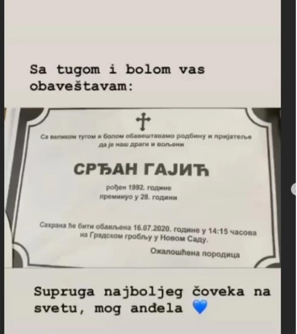 - Sa tugom i bolom obaveštavamo rodbinu i prijatelje na je Srđan Gajić rođen 1992. preminuo u 28. godini - stoji na umrlici, dok je u potpisu napisano: "Supruga najboljeg čoveka na svetu, mog anđela."