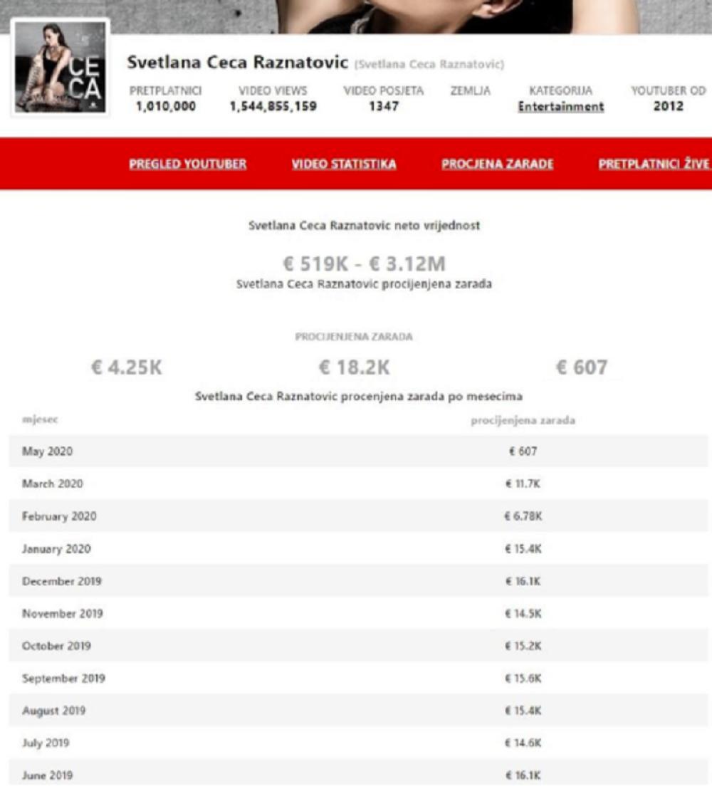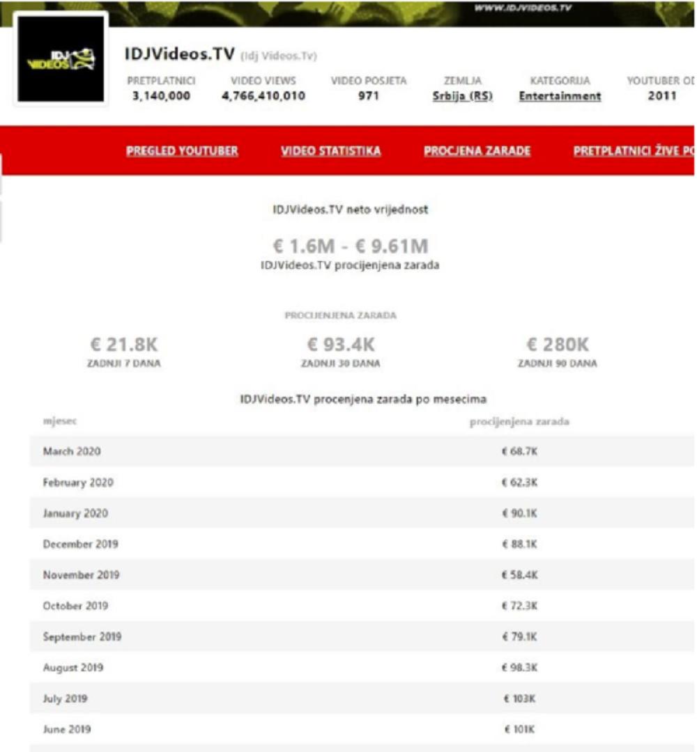 Tokom aprila, maja i juna nema podataka o zaradi, što znači da je verovatno nisu ni imali, dok je za jul procenjena dobit tek oko 6.000 evra. Na primeru "Granda" jasno se vidi da su za samo četiri meseca ostali bez prihoda od približno 200.000 evra na Jutjubu.