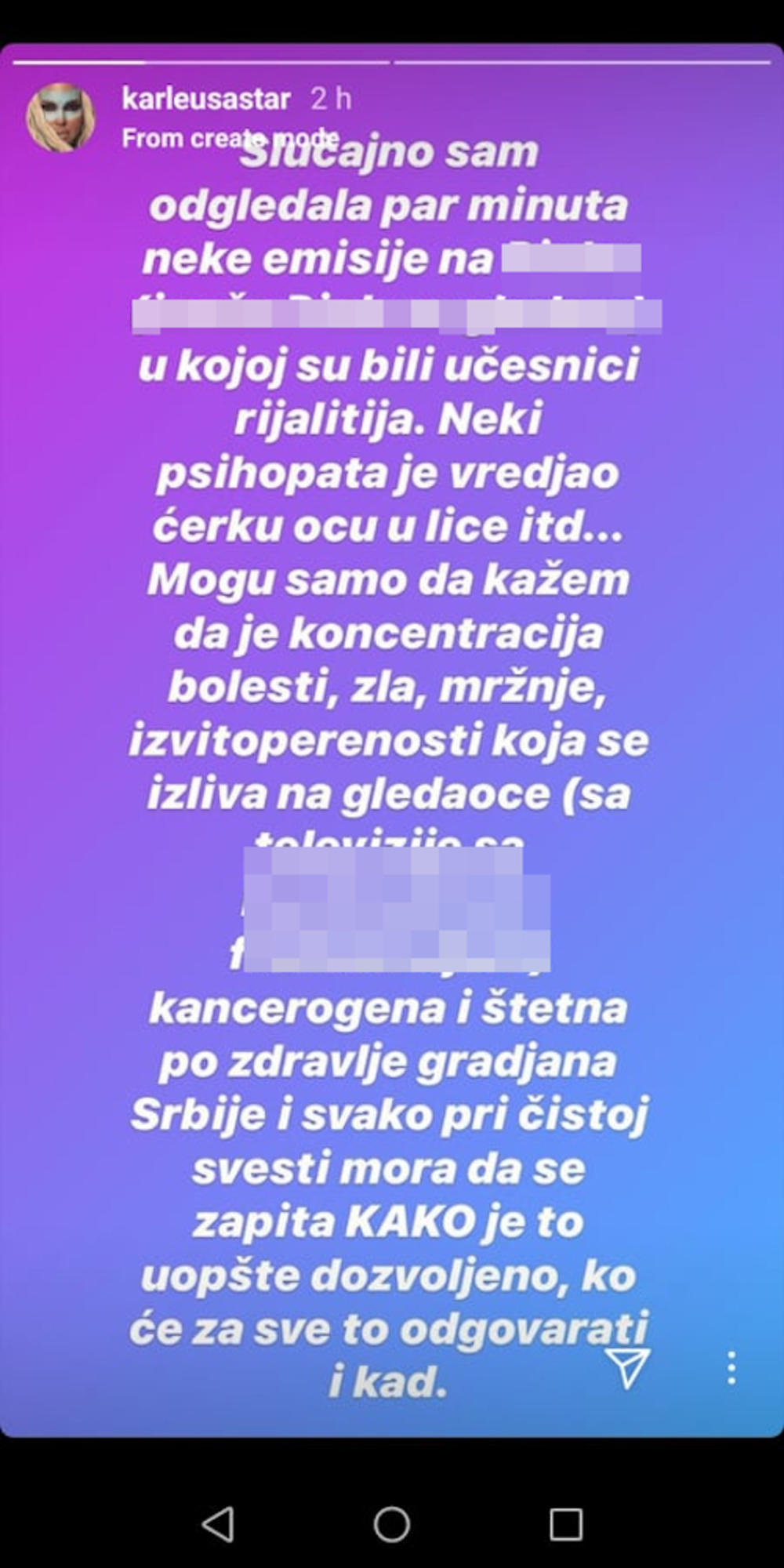 Ovoga puta ona je podelila sa svojim pratiocima da je uhvatila deo emisije u kojoj su gošće bili Marko Đedović i Gagi Đogani, a ono što ju je posebno šokiralo jeste naćin na koji je dotični zadrugar govorio o ćerki svog bivšeg cimera.