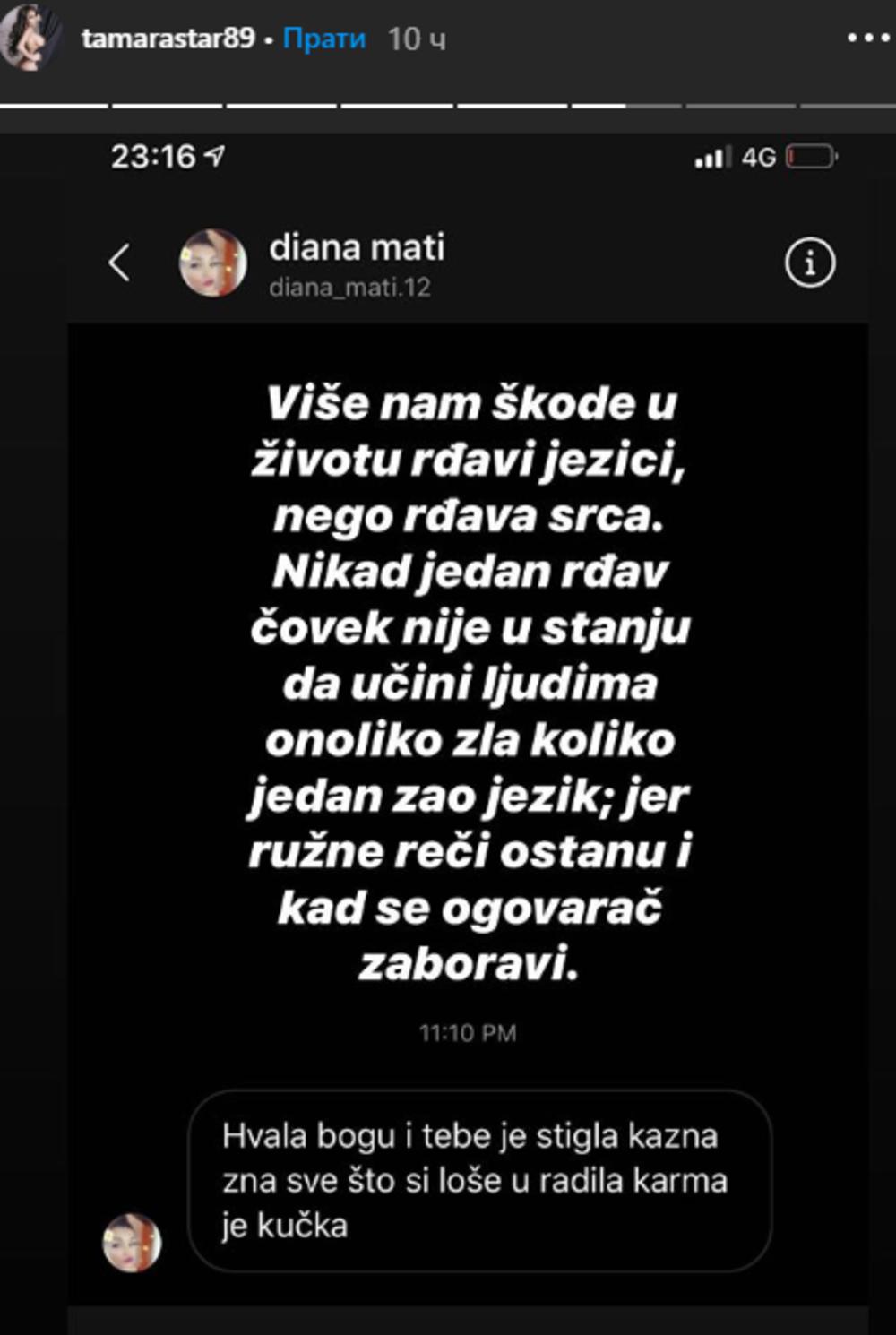 - Hvala bogu i tebe je stigla kazna za sve što si loše uradila, karma je kučka - jedna žena je imala poruku koju je uputila Tamari.