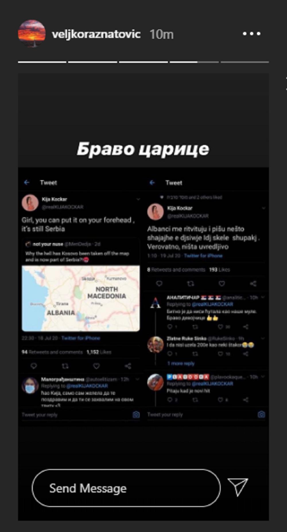 “Devojko, možeš Kosovo da staviš i na čelo, ono će i dalje biti u Srbiji” i “Albanci me retvituju i pišu nešto. Verovatno ništa uvredljivo” dva su Kijina Tvita koja su privukla veliku pažnju korisnika ove društvene mreže, pa je i Veljko imao potrebu da je pohvali zbog stava koji je iznela.