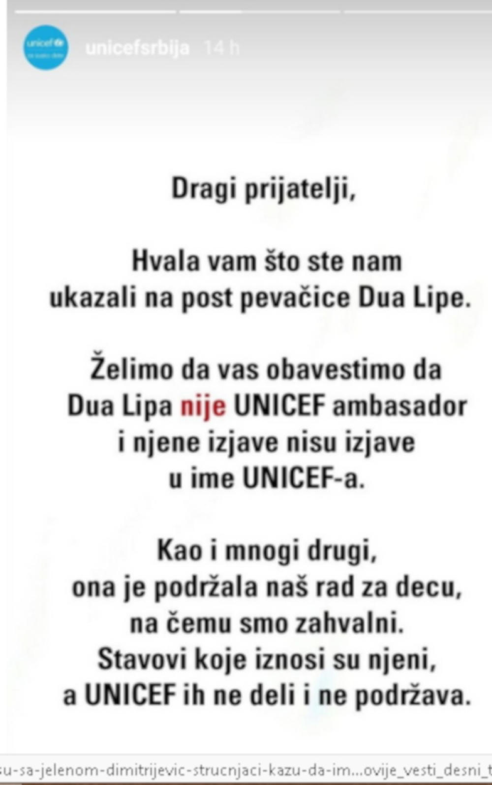 - Dragi prijatelji, hvala što ste ukazali na post pevačice Due Lipe. Želimo da vas obavestimo da Dua Lipa nije UNICEF ambasador i njene izjave nisu izjave u ime UNICEFA-a. Kao i mnogi drugi, ona je podržala naš rad za decu, na čemu smo zahvalni. Stavovi koje iznosi su njeni, a UNICEF ih ne podržava - piše u saopštenju.