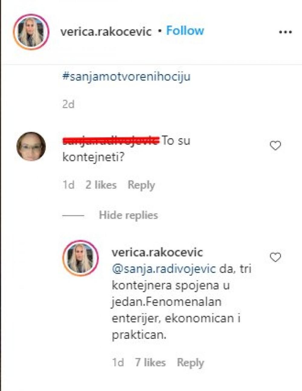 Verica je sada svojim pratiocima pokazla deo svog raja, a jedan od komentara je Vericu naterao da da iznese neke detalje o vikendici. Po svemu sudeći, ona je spojila tri kontejnera i napravila postor.