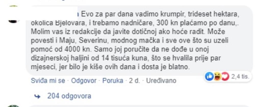 “Evo za par dana vadimo krompir, trideset hektara, okolina Bjelovara, i trebaju nam nadničari, 300 kn plaćamo po danu. Molim vas iz redakcije da javite dotičnoj ako hoće da radi. Može povesti i Maju, Severinu, modnog mačka i sve ove što su uzeli pomoć od 4000 kn. Samo joj poručite da ne dođe u onoj dizajniranoj haljini od 14 hiljada kuna, što se hvalila pre par meseci, jer bilo je kiše ovih dana i dosta je blatnjavo”, napisala je jedna osoba na Facebook profilu ispod Indexovog teksta i prikupila skoro 2500 lajkova i mnoštvo komentara.
