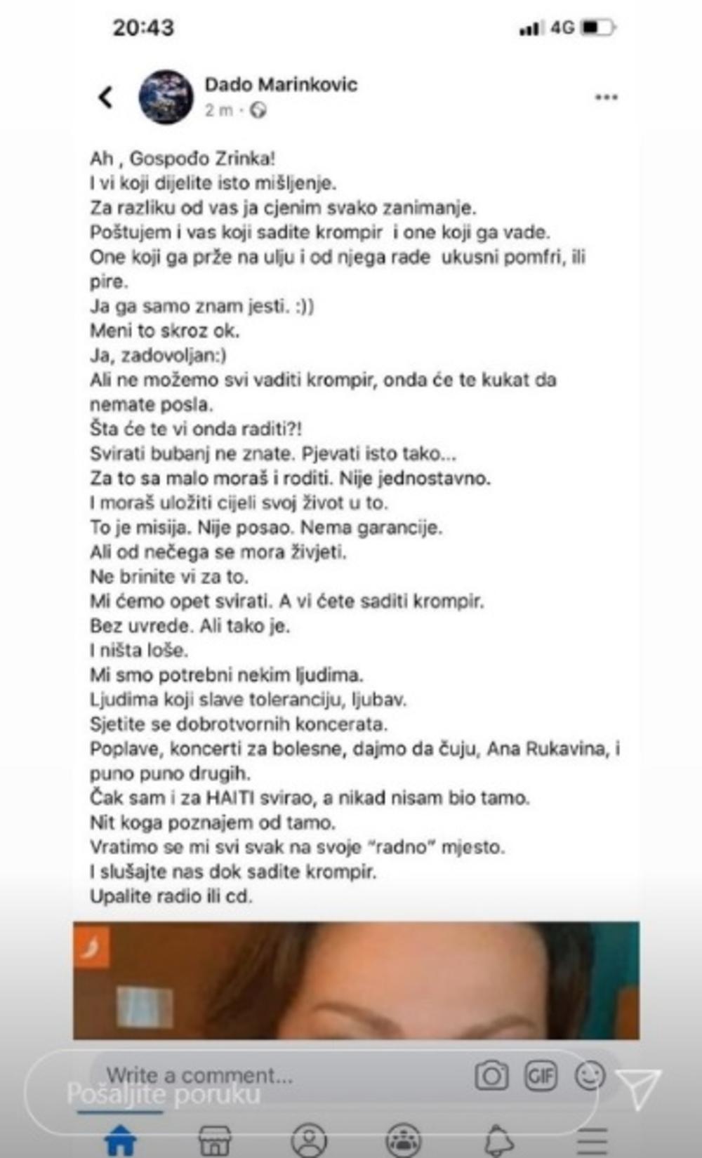 “Ajde nek mi sjašu svi sa profila koji misle da bi mi umetnici, muzičari i sve moje kolege trebali kopati krompire, zato što zbog mera uzrokovanih Kovidom nemamo mogućnosti normalno raditi. Ajde ljudi u miru da vas ne moram blokirati. Hvala i svako dobro.”