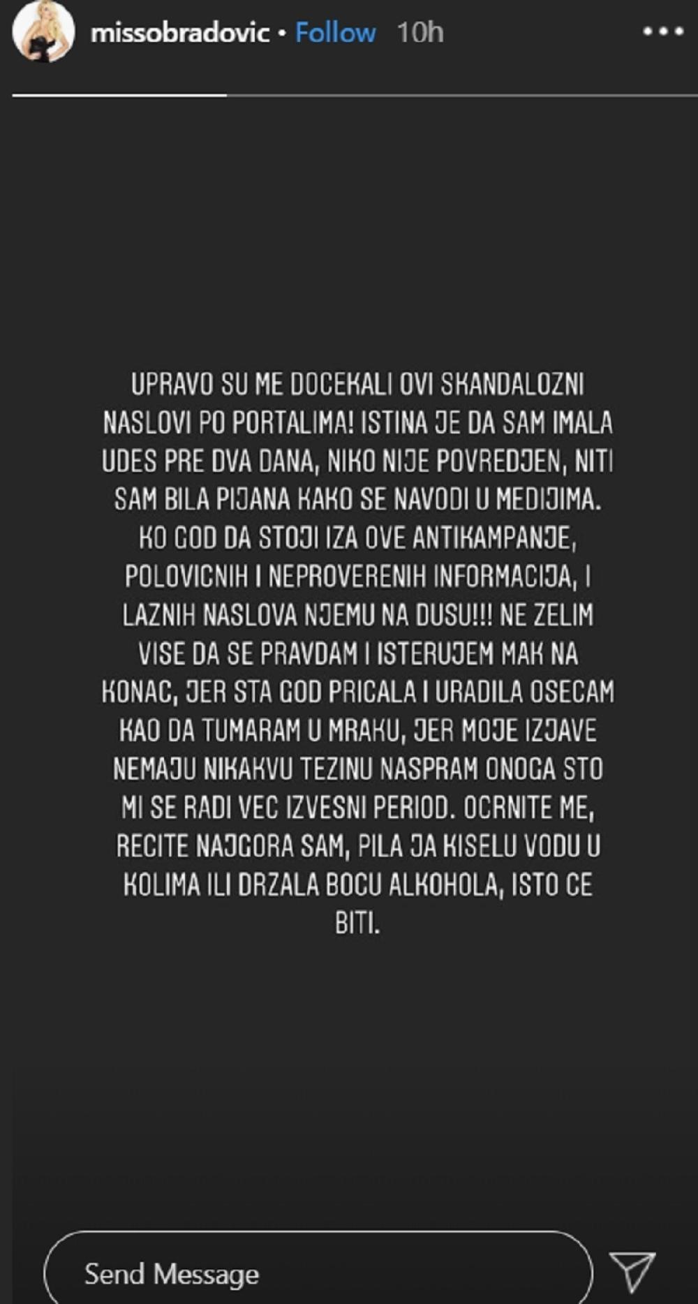 - Upravo su me dočekali ovi skandalozni naslovi po portalima! Istina je da sam imala udes pre dva dana, niko nije povređen, niti sam bila pijana kako se navodi u medijima. Ko god da stoji iza ove antikampanje, polovičnih i neproverenih informacija i lažnih naslova njemu na dušu. Ne želim više da se pravdam i isterujem mak na konac, jer šta god pričala i uradila osećam kao da tumaram u mraku, jer moje izjave nemaju nikakvu težinu naspram onoga što mi se radi već izvesni period. Ocrnite me, recite najgora sam, pila ja kiselu vodu u kolima ili držala bocu pića, isto će biti - napisala je Sandra na svom Instagram profilu.