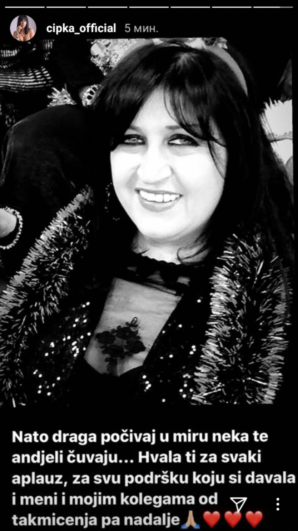 – Nato, počivaj u miru neka te anđeli čuvaju... Hvala ti za svaki aplauz, za svu podršku koju si davala i meni i mojim kolegama od takmičenja pa nadalje - navela je na "Instagramu" zvezda "Granda" Aleksandra Tadić Cipka.