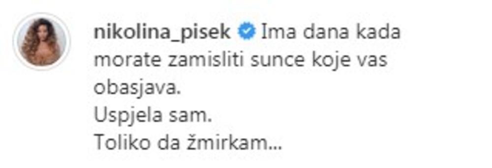 Nikolina Pišek oglasila se putem društvene mreže Instagram po prvi put nakon stravične ispovesti o, kako se navodilo, "odmoru iz pakla" u Kaštelu u Hrvatskoj. Po svemu sudeći, ona se trudi da zaboravi na nemili događaj.