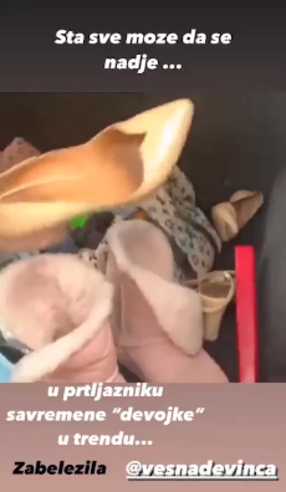 Tako je voditeljka počela da pokazuje da se u gepeku nalaze brojni odevni komadi, od čizmi za zimu, preko štiki, pa sve do rolera i patika za trčanje, ali i popularne papuče Bottega Veneta čija je cena - 680 evra.