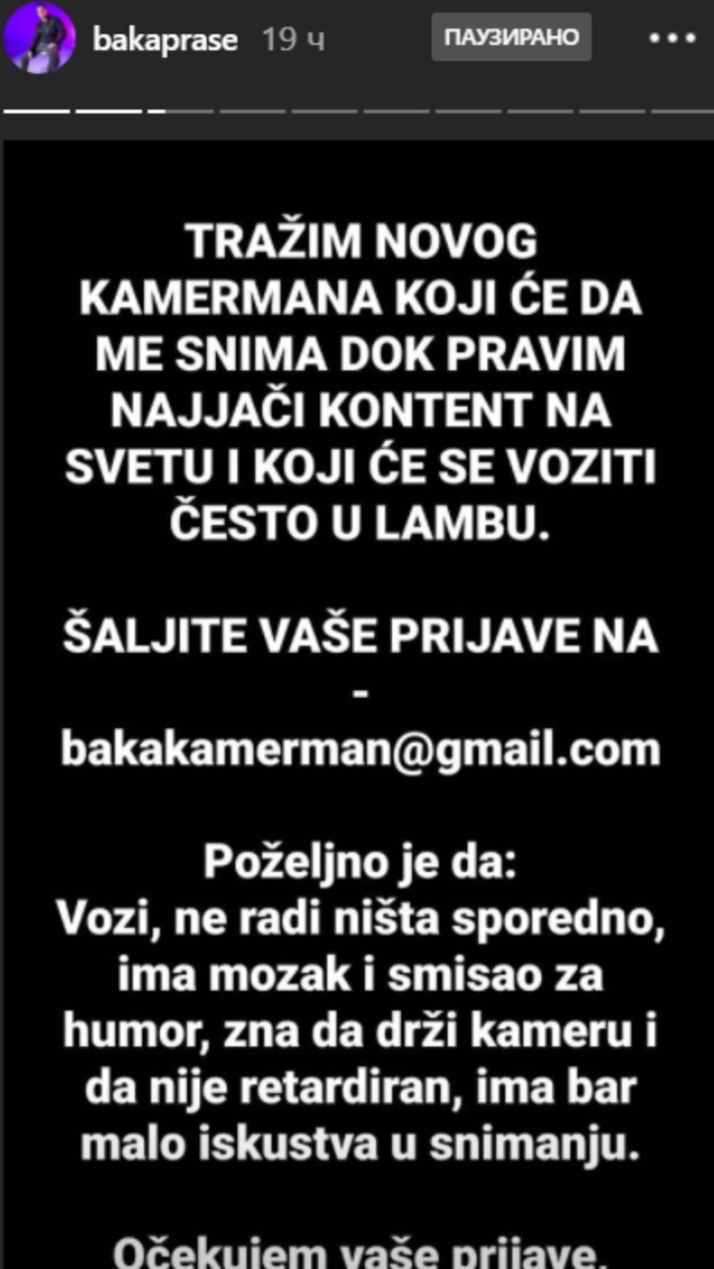 Jutjuber je na svom Instagram storiju objavio da je raspisao konkurs za svog ličnog kamermana, a takođe je dodao koji su uslovi za ovu poziciju.