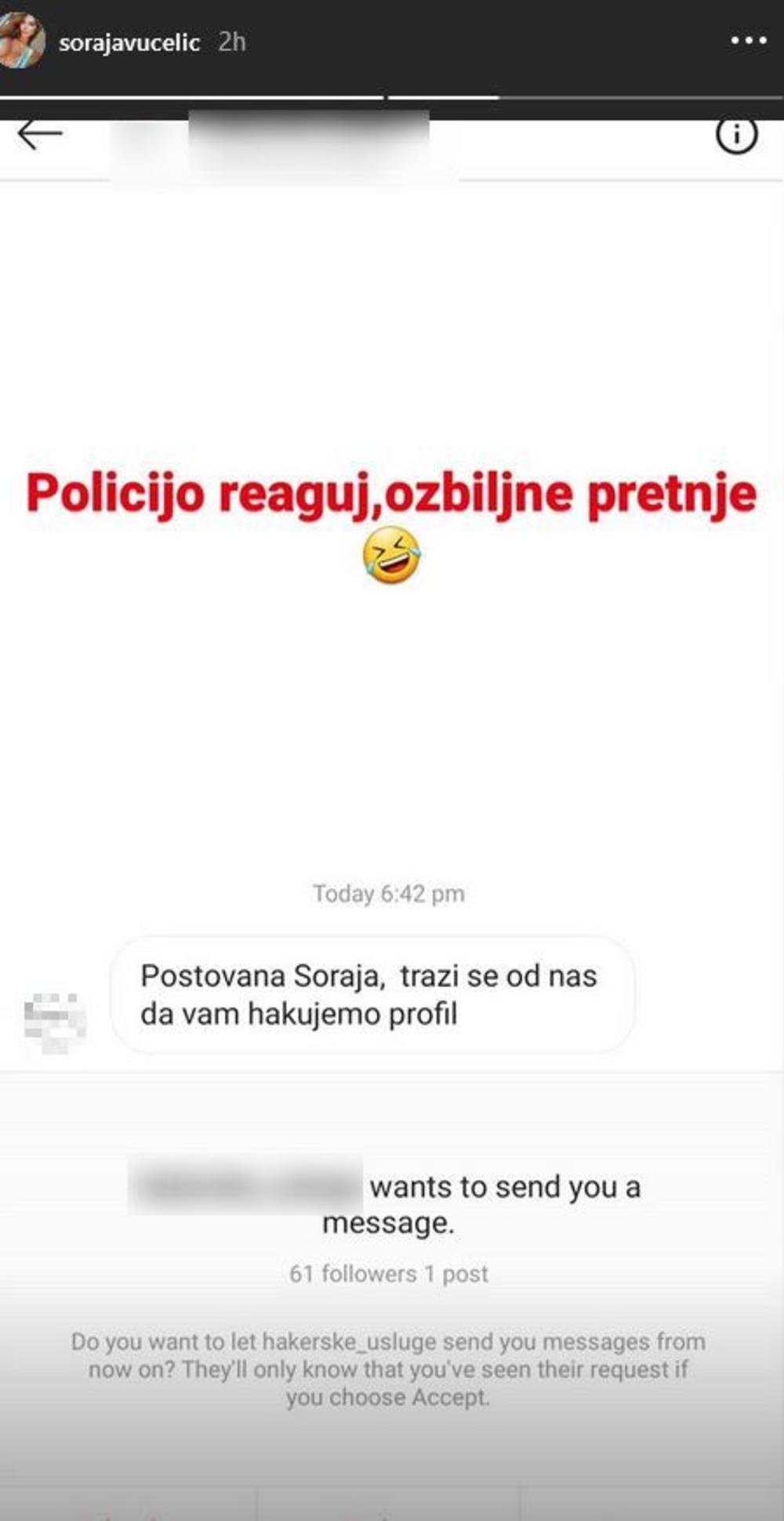 Naime, jedan Instagram nalog koji se bavi hakovanjem tuđih profila dobio je zahtev da hakuje nalog Vučelićeve, ali je ovaj upit očigledno odbijen budući da su administratori stranice o tome obavestili samu starletu.