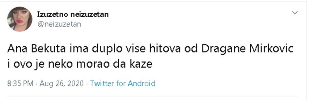 Jedan komentar na društvenoj mreži "Twitter" je izazvao žestoku raspravu među fanovima folk dive Dragane Mirković i njene koleginice Ane Bekute. – Ana Bekuta ima duplo više hitova od Dragane Mirković i ovo je neko morao da kaže - glasio je pomenuti tvit.