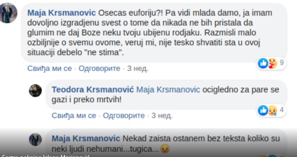 Osećaš euforiju?! Pa vidi, mlada damo, ja imam dovoljno izgrađenu svest o tome da nikada ne bih pristala da glumim, nedajbože, neku tvoju ubijenu rođaku! Razmisli malo ozbiljnije o svemu ovome. Veruj mi, nije teško shvatiti šta u ovoj situaciji debelo "ne štima". Nekada zaista ostanem bez teksta koliko su neki ljudi nehumani, tugica! - napisala je Maja, a ubrzo se oglasila i Teodora i još oštrije potkačila Pavlovićku: