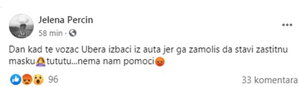 Dan kad te vozač Ubera izbaci iz auta jer ga zamoliš da stavi zaštitnu masku. Tututu...nema nam pomoći - napisala je Jelena. Prijatelji su joj u komentarima savetovali da neprijatnog vozača odmah prijavi Uberu, jer po njihovim pravilima i vozač i putnici moraju imate maske na licu.