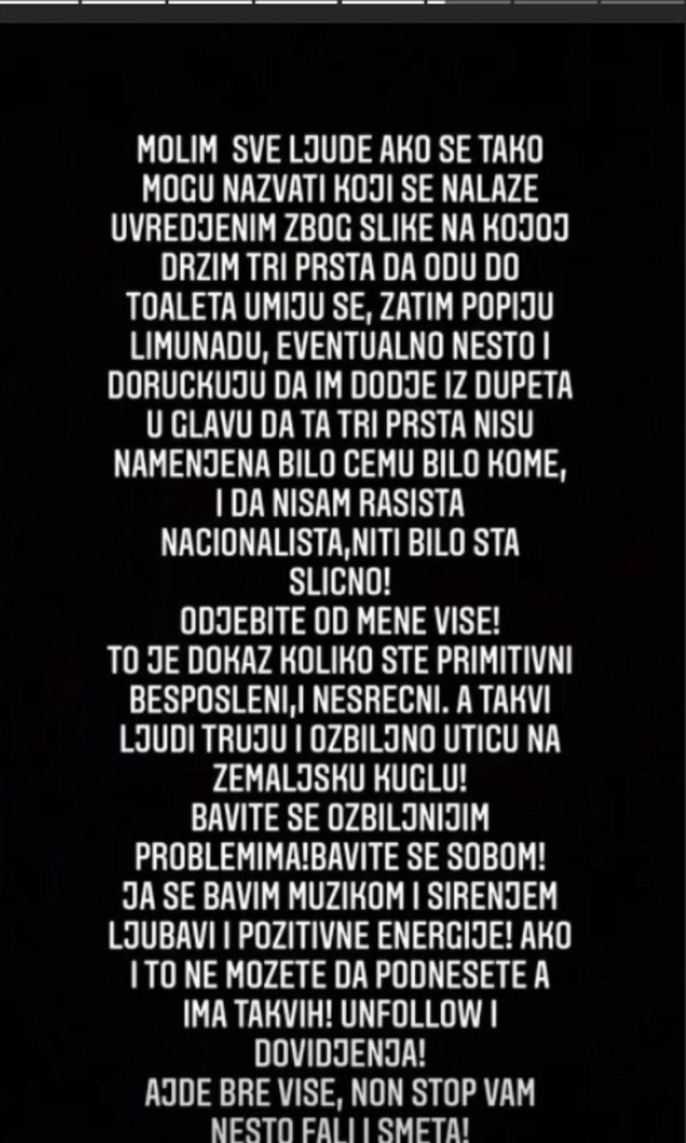 Molim sve ljude, ako se tako mogu nazvati koji se nalaze uvređenim zbog slike na kojoj držim tri prsta, da odu do toaleta, umiju se, zatim popiju limunadu, eventualno nešto i doručkuju, da im dođe iz d*peta u glavu da ta tri prsta nisu namenjena bilo čemu, bilo kome i da nisam rasista, nacionalista, niti bilo šta slično! Odj*bite od mene više! To je dokaz koliko ste primitivni, besposleni i nesrećni. A takvi ljudi truju i ozbiljno utiču na zemaljsku kuglu. Bacite se ozbiljnijim problemima, bavite se sobom! Ja se bavim muzikom i širenjem ljubavi i pozitivne energije. Ako i to ne možete da podnesete, a ima takvih – unfollow i doviđenja! Ajde bre više, non stop vam nešto fali i smeta - poručila je pevačica.