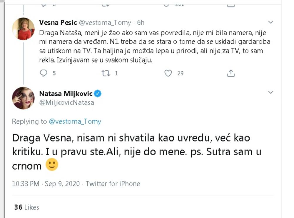 – Dragana Vesna, nisam shvatila kao uvredu, već kao kritiku. I u pravu ste. Ali, nije do mene. P.S. Sutra sam u crnom - odgovorila je Nataša na kraju ove rasprave na mreži "Twitter".