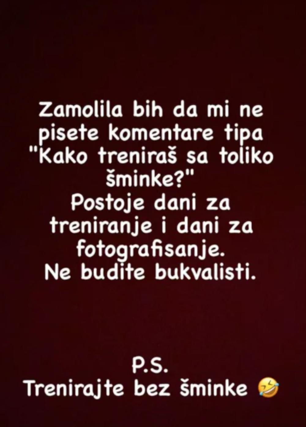 - Zamolila bih da mi ne pišete komentare tipa:"Kako treniraš sa toliko šminke?". Postoje dani za treniranje i dani za fotografisanje. Ne budite bukvalisti. P.S.: Trenirajte bez šminke - poručila je pevačica.