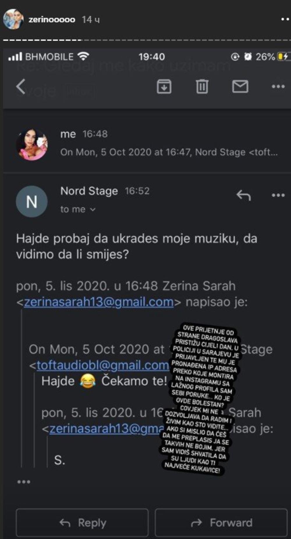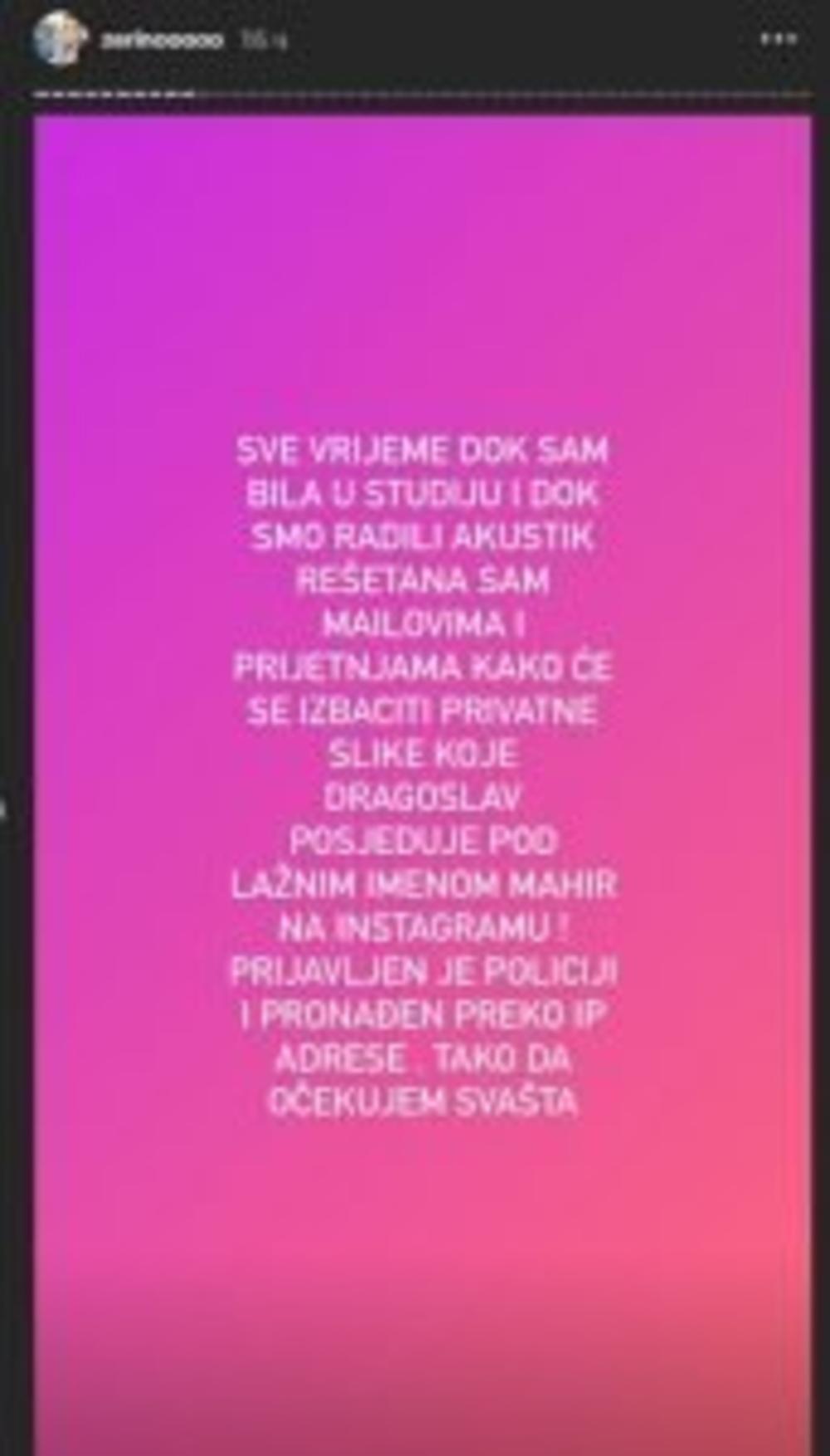 “Znaci čovek je virtuoz! Provalio je gmail, još odavno se povezao sa mojim mailom očito dok smo živeli zajedno , i sada se uz NEČIJU pomoć setio kako da hakuju. Uspešno mi je hakovan kao sto vidite mail preko kojeg mi je inače poslata svaka poruka od strane njega u zadnjih 2 meseca. Trenutno ima kontrolu nad svim. Ne znam da li ima čak i pristup iCloud-u jer me ništa više od te osobe ne može iznenaditi. Pokušavam uz pomoć nekih ljudi da sačuvam Instagram te stalno menjamo šifre. Šta da me šokira više, apsolutno ništa ali da te neću plasirati javno i svaki tvoj korak, itekako hoću , jer tvoja bolest nema kraja, javno ćutis dok ja OPRAVDANO BESNIM, dok privatno maltretiraš. Evo čekam da vidim šta je sledeće sto ćeš da uradiš! Ovo je još jedno u nizu tvojih krivičnih dela. S obzirom da si toliko okupiran mnom, ne preostaje mi ništa drugo nego da pokazujem tvoju okupiranost. Nažalost ti nisi jedini “slučaj” ovakvog tipa. Pa eto neka budeš “primer” kako ne treba , odnosno kako se ponašaju osobe poput tebe. U medicini postoji naziv za to, pa evo nek’ ti neko dodeli dijagnozu , ja neću , jer nisam psihijatar!”, napisala je ona opširno o čemu je zapravo reč, u svojoj poslednjoj objavi na Instagramu.