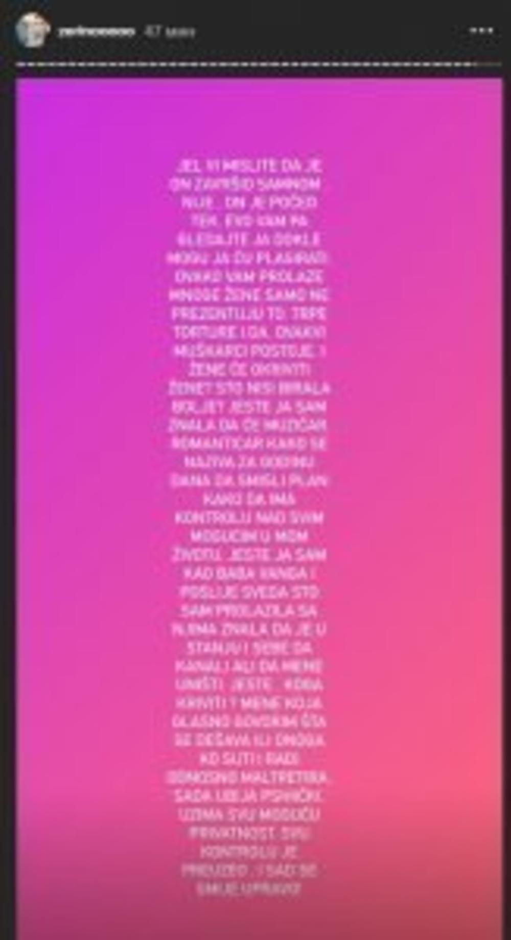 Ona je tada između ostalog izjavila da ju je Dado psihički i fizički maltretirao, te da je imala pobačaj i još mnoge stvari koje su šokirale publiku. Izgleda da se strasti kod njih ni sada ne smiruju, pa je tako Zerina na svom Instagram nalogu objavila epilog ove priče.