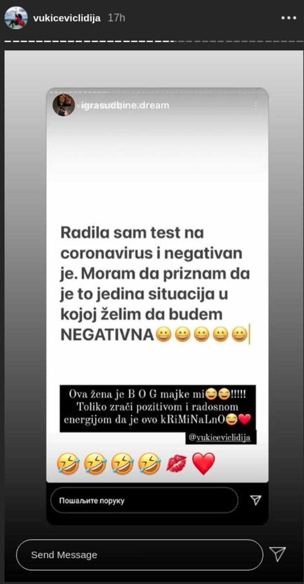 - Radila sam test na koronavirus i negativan je. Moram da priznam da je to jedina situacija u kojoj želim da budem negativna - napisala je glumica na svom profilu.