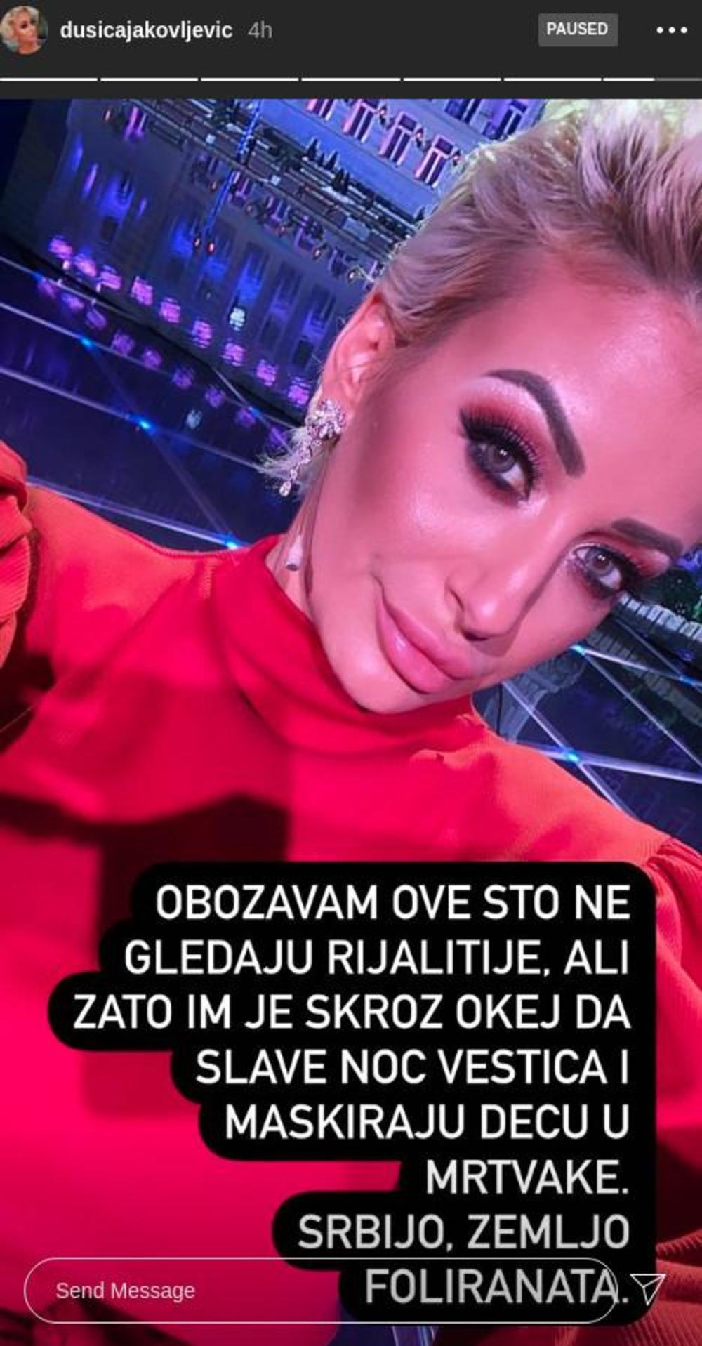 - Obožavam ove što ne gledaju rijalitije, ali zato im je skroz okej da slave Noć veštica i maskiraju decu u mrtvake. Srbijo, zemljo foliranata - napisala je Dušica.
