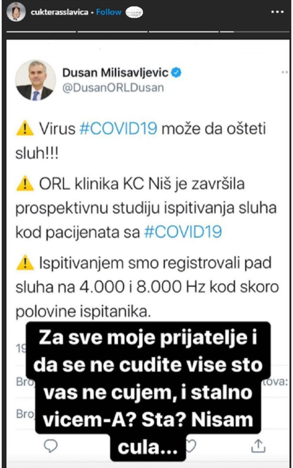 Naime, njoj je pažnju privukla objava doktora Dušana Milosavljevića, koji je na Tviteru napisao da koronavirus može da ošteti sluh.