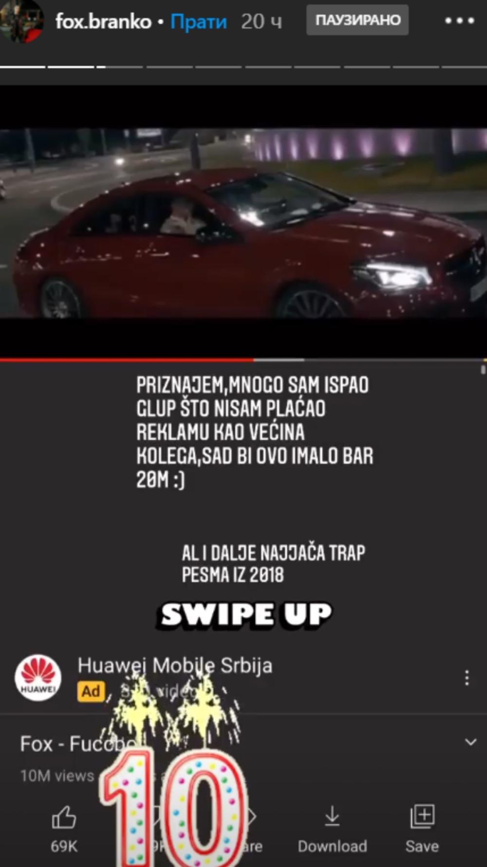 - Priznajem, mnogo sam ispao glup što nisam plaćao reklamu kao većina kolega, sada bi ovo imalo barem 20 miliona - napisao je on u svom Insta storiju, pa dodao da je uprkos pregledima kojima on lično nije zadovoljan, njegova numera ,,Fuccboi" najjača trep pesma iz 2018. godine. Ova stvar sada ima deset miliona pregleda.