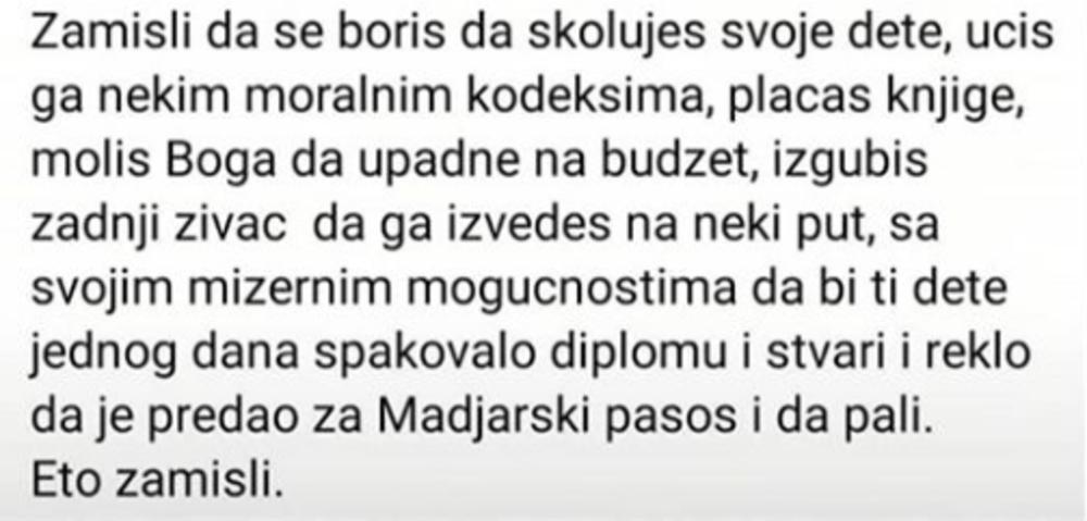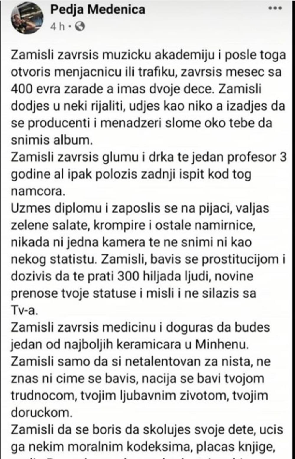 - Zamisli, završiš muzičku akademiju i posle toga otvoriš menjačnicu ili trafiku, završiš mesec sa 400evra zarade, a imaš dvoje dece. Zamisli dođeš u neki rijaliti, uđeš kao niko, a izađeš da se producenti i menadzeri slome oko tebe da snimiš album. Zamisli završiš glumu i d*ka te jedan profesor tri godine, ali ipak položiš poslednji ispit kod tog namćora. Uzmeš diplomu i zaposliš se na pijaci, valjaš zelene salate, krompire i ostale namirnice, nikada ni jedna kamera te ne snimi ni kao statistu. Zamisli, baviš se prostitucijom i doživiš da te prati 300 hiljada ljudi, novine prenose tvoje statuse i misli, i ne silaziš sa TV- a. Zamisli, završiš medicinu i doguraš da budeš jedan od najboljih keramičara u Minhenu. Zamisli samo da si netalentovan ni za šta,ne znaš ni čime se baviš, nacija se bavi tvojom trudnoćom, tvojim ljubavnim životima,tvojim doručkom. Zamisli, da se boriš da školuješ svoje dete, učiš ga nekim moralnim kodeksima, plaćaš knjige, moliš Boga da upadne na budzet, izgubiš poslednji živac da ga izvedeš na neki put sa svojim mizernim mogućnostima, da bi ti dete jednog dana spakovalo diplomu i stvari, i reklo da je predao za Madjarski pasoš i da pali. Eto zamisli! - napisao je pevač vidno iznerviran trenutnim životom!
