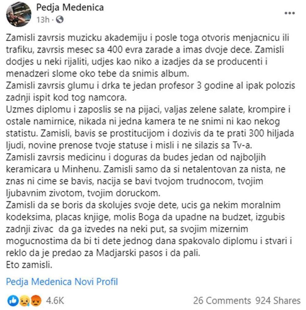 Pevač Peđa Medenica izazvao je brojne reakcije na Fejsbuku statusom koji je danas napisao, a u kom je iskritikovao društvo koje ne ceni obrazovanje, talenat i rad, nego ličnosti koje nemaju šta da pokažu i koje uspevaju da postanu poznate i bogate bez imalo truda.